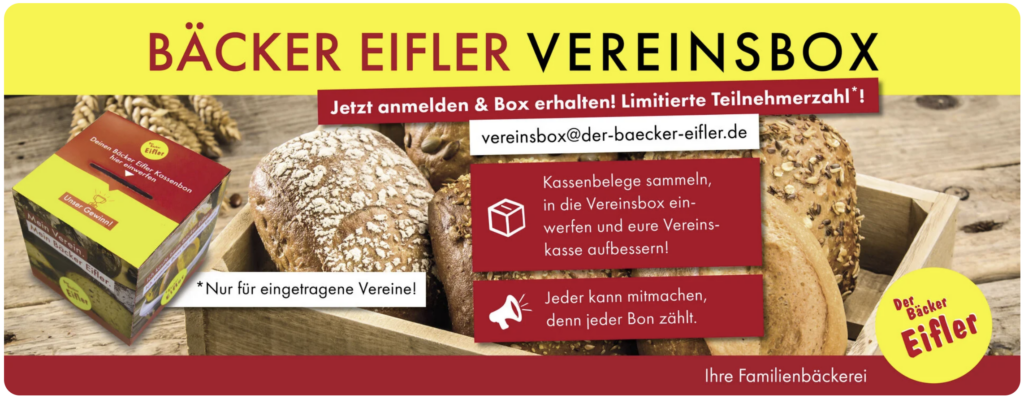 Daher sammelt die Kassenzettel vom Bäcker Eifler und werft die originalen Kassenzettel (keine Kopien, elektrische Bons, etc.) direkt in unsere Vereinsbox (diese steht während der ZVB-Kurse in Raum A101 der Georg-Kerschensteiner-Schule) oder sendet uns die Kassenzettel direkt per Post zu (ZVB Obertshausen 1964 e. V., Patrick Sahm, Fröbelstr. 12, 63179 Obertshausen).